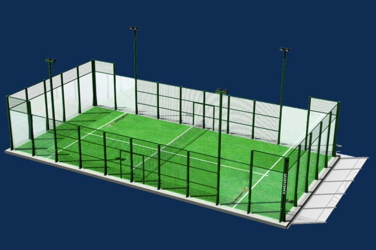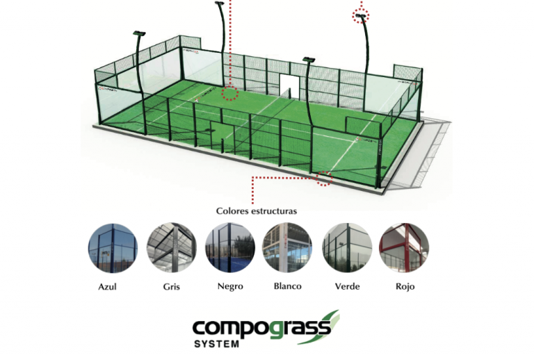 – 200 m2 de césped artificial verde o azul texturizado para pádel de 12 mm de altura con línea blanca de juego incorporada.